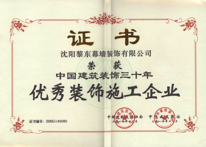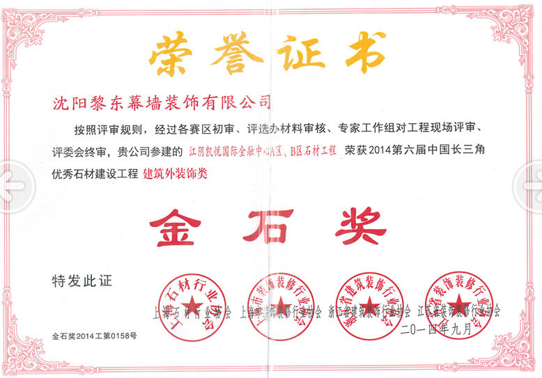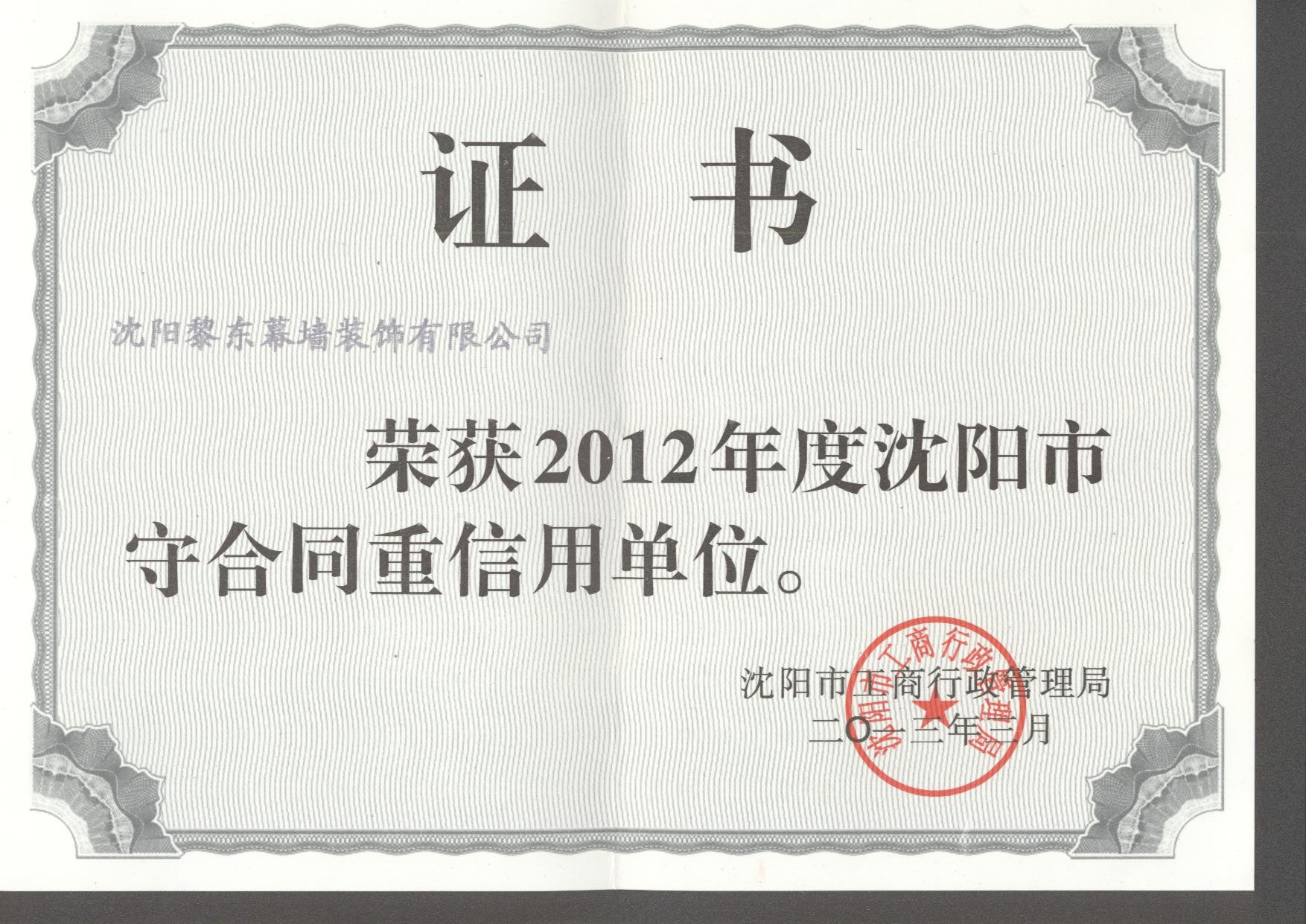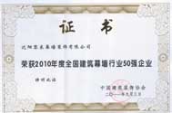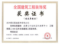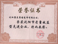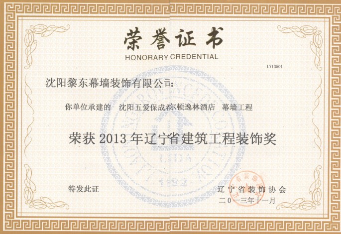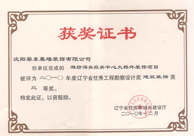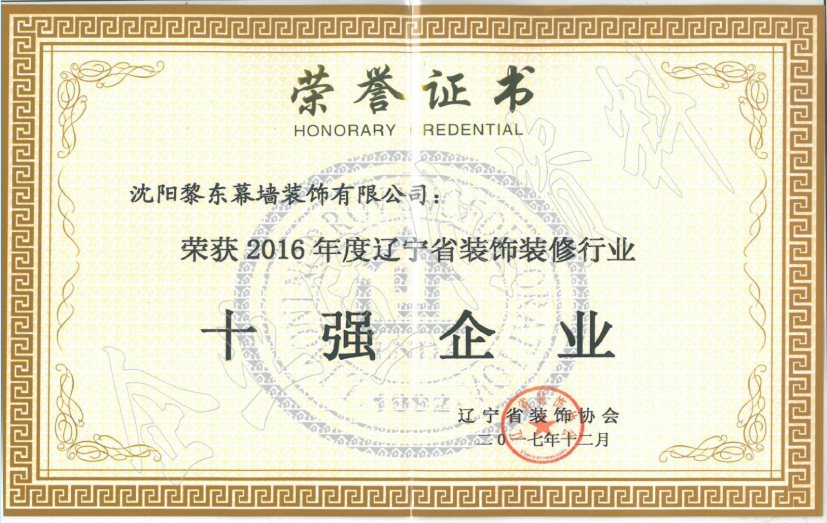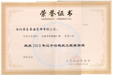 | 2010年榮獲遼寧省裝飾裝修行業(yè)優(yōu)秀企業(yè)家 | 2012年榮獲全國建筑幕墻行業(yè)50強企業(yè) | 2012年榮獲沈陽市守合同重信用單位 |