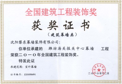 | 2011年獲大連萬和購物廣場遼寧省建筑工程裝飾獎 | 2010年獲濰坊海關(guān)報關(guān)中心大樓外裝飾優(yōu)秀勘察設(shè)計獎 | 2010年獲濰坊海關(guān)報關(guān)中心全國建筑工程裝飾獎 |