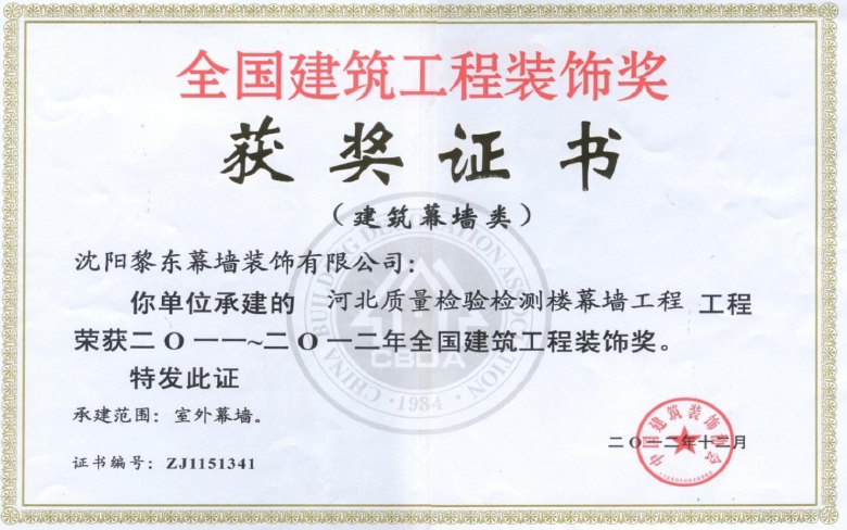 | 2010年獲守合同重信用單位 | 2010年榮獲遼寧省裝飾裝修行業(yè)建筑幕墻專業(yè)十強企業(yè) | 2011年河北質(zhì)量檢驗檢測大樓外裝飾工程榮獲河北省建筑工程裝飾獎 |